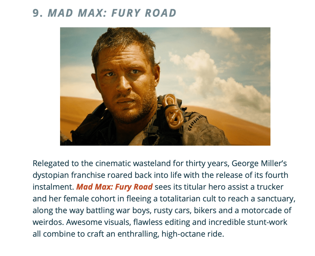 On Parry’s page he grades his films out of five stars, five stars being the best and one star being the worst. After viewing a few of his reviews I like this grading system and am considering implementing a similar idea on my page. Parry also chooses not to stick with just doing stand-alone film reviews. In 2019 as the year closed, he had blogs for the best and worst movies of the decade along with T.V and ranking his favorite stand out actors and actresses of the decade. Along with this he reviews older movies that are current to the movies coming out soon. If a marvel movie is coming out soon, he will review another marvel movie that relates to it.